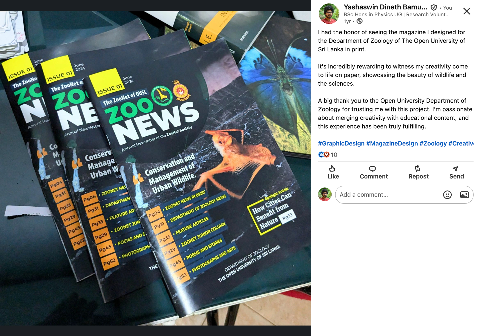 At OUSL, I became actively involved in academic societies, particularly ZooNet – the official student–staff society of the Department of Zoology. I contributed extensively to science communication through print and digital design.