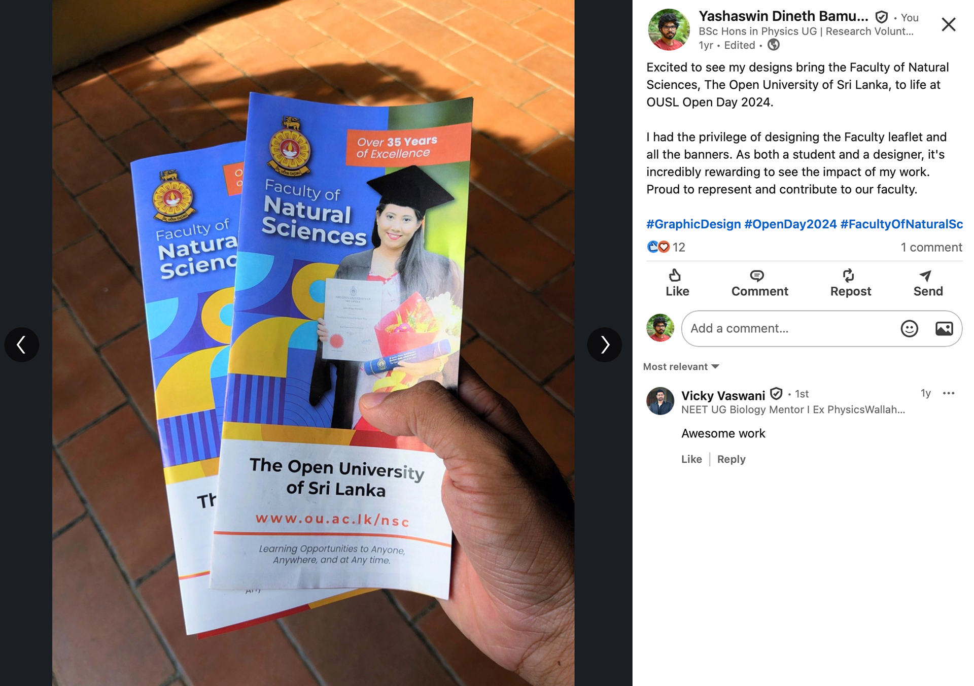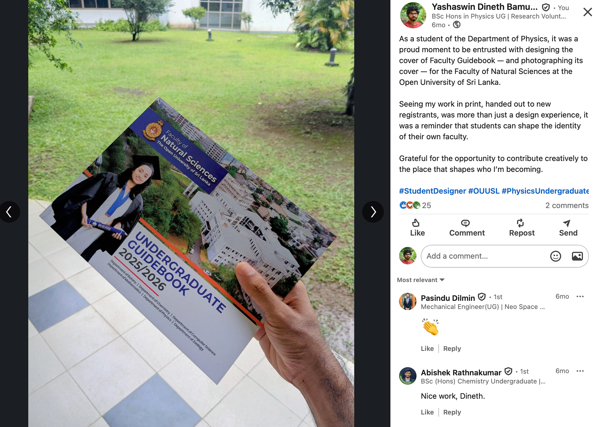 Currently, I am completing my BSc (Hons) in Physics – Special Degree Program at the Open University of Sri Lanka, having maintained a strong academic record in physics. Alongside my studies, I continue professional work in print design and digital visual communication, collaborating across academic, industrial, and educational contexts.